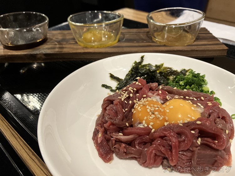 多めのユッケに、タレ、塩、レモンペッパーの3種のタレが。