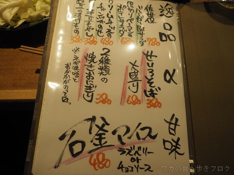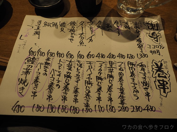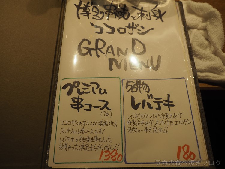 希少部位の戻しちょうちん180円、砂肝150円、豚バラ150円、もも180円