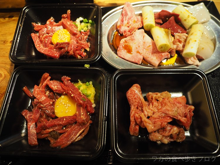 塩ダレユッケ500円 2皿 夜市特盛1200円(右上) 松阪牛切り落としロース880円