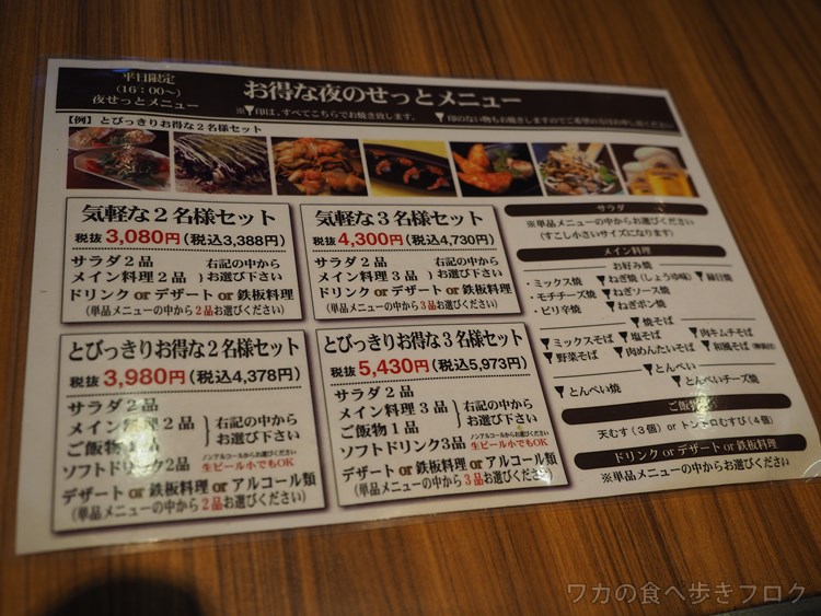 単品メニューからサラダを選んで、メインを選んで、ドリンクかデザートか鉄板焼きか・・・