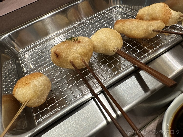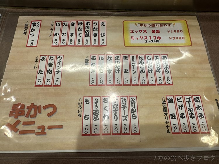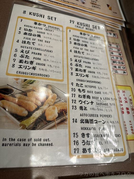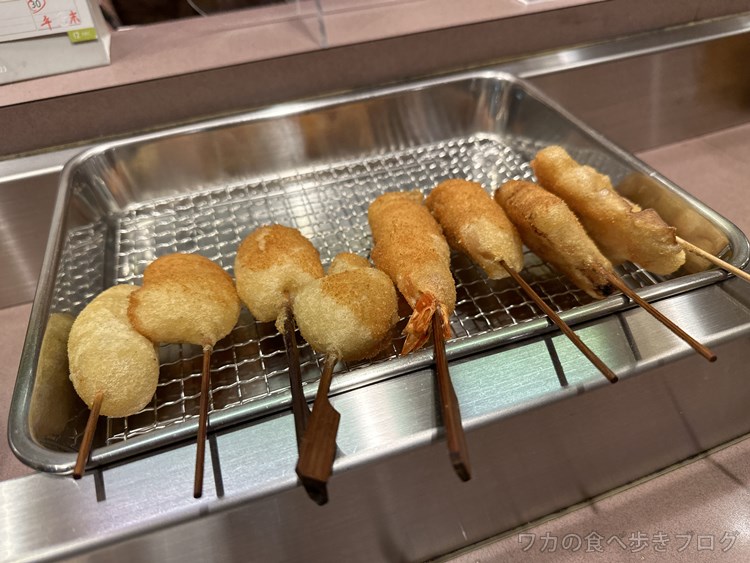 左から串カツ(牛)、いか、魚、ほたて、えび、ぶた、たまねぎ、えりんぎ