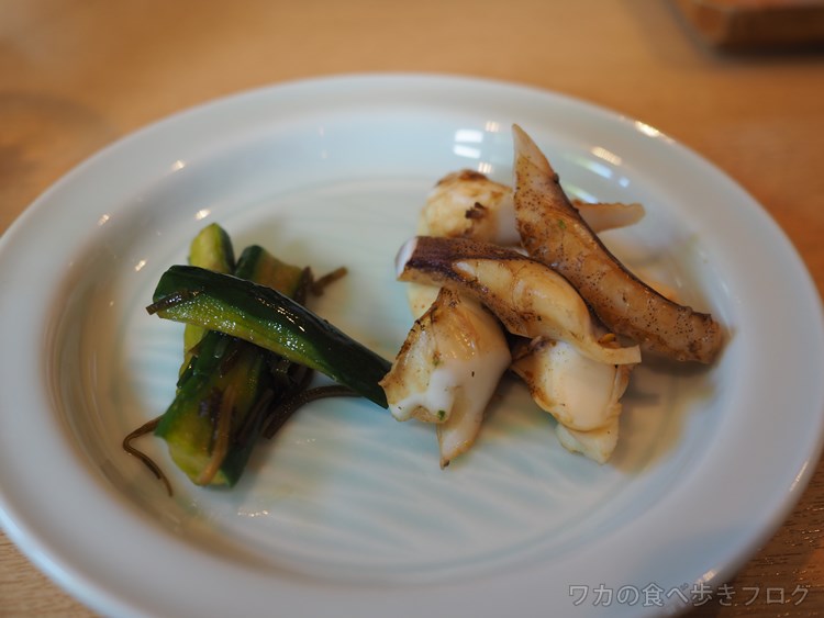 あおりいかのゲソ焼き、箸休めのきゅうり